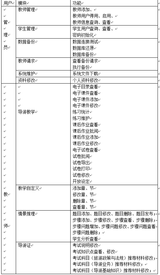 該導(dao)游(you)(you)業務與(yu)技能(neng)(neng)教學(xue)軟件在功(gong)能(neng)(neng)上,以(yi)管理員、教師端、學(xue)生端三種(zhong)權限(xian)設(she)置各自功(gong)能(neng)(neng),完全(quan)能(neng)(neng)滿足旅游(you)(you)業務與(yu)機能(neng)(neng)教學(xue)要(yao)求。平臺通過精彩的(de)內(nei)容、強大的(de)功(gong)能(neng)(neng)、友好的(de)界面(mian),可靠的(de)性能(neng)(neng),實(shi)現(xian)導(dao)游(you)(you)業務與(yu)機能(neng)(neng)教學(xue)的(de)時代(dai)性跨(kua)越。