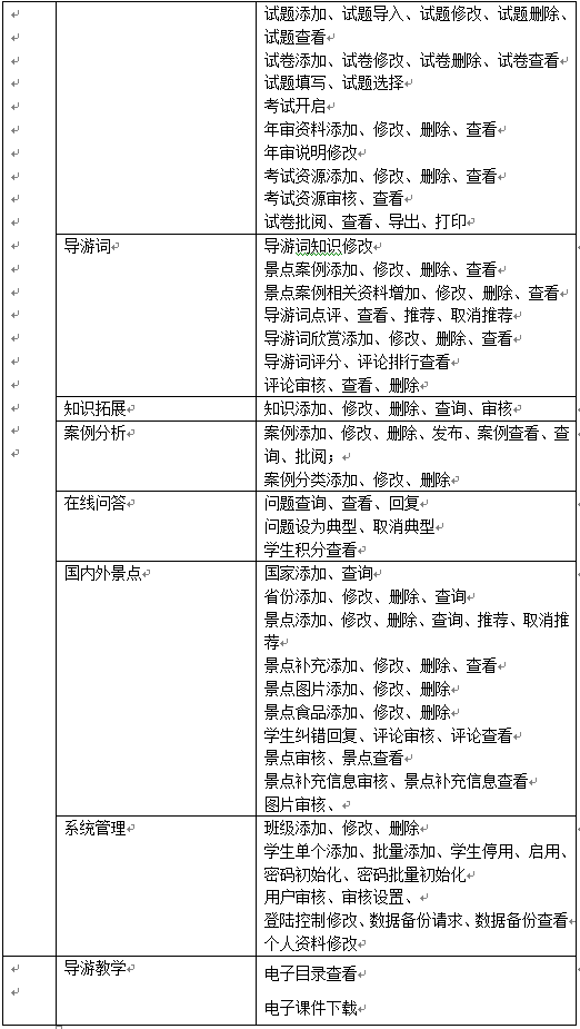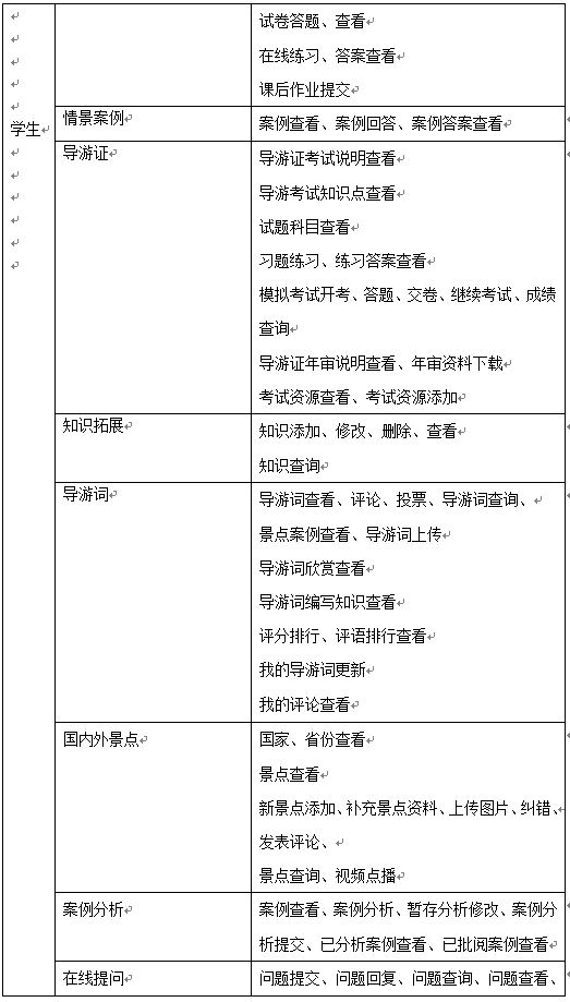 學(xue)(xue)(xue)生的主要功能是(shi)導游(you)教學(xue)(xue)(xue)知識的學(xue)(xue)(xue)習、完成情景推理中包含(han)的案例(li)及題(ti)目、導游(you)證考試學(xue)(xue)(xue)習及模擬考試、導游(you)拓展知識學(xue)(xue)(xue)習,同時可添(tian)加(jia)新的知識供其他(ta)同學(xue)(xue)(xue)學(xue)(xue)(xue)習、導游(you)詞學(xue)(xue)(xue)習并編寫導游(you)詞、國內外景點學(xue)(xue)(xue)習、案例(li)分析和在(zai)線(xian)提問。