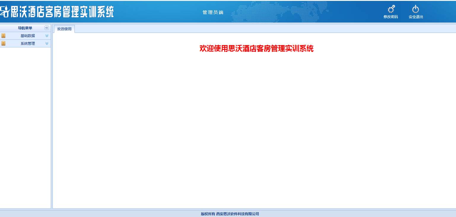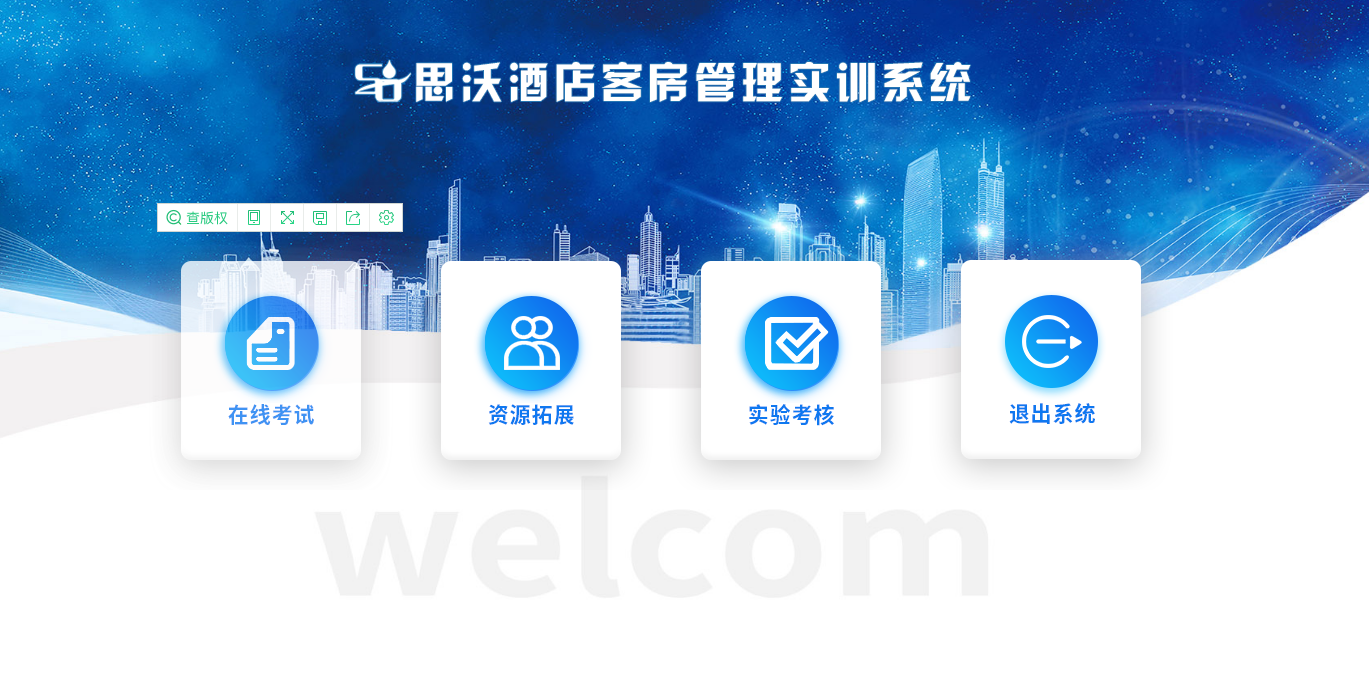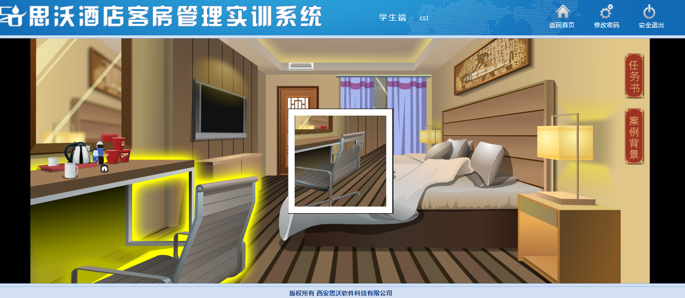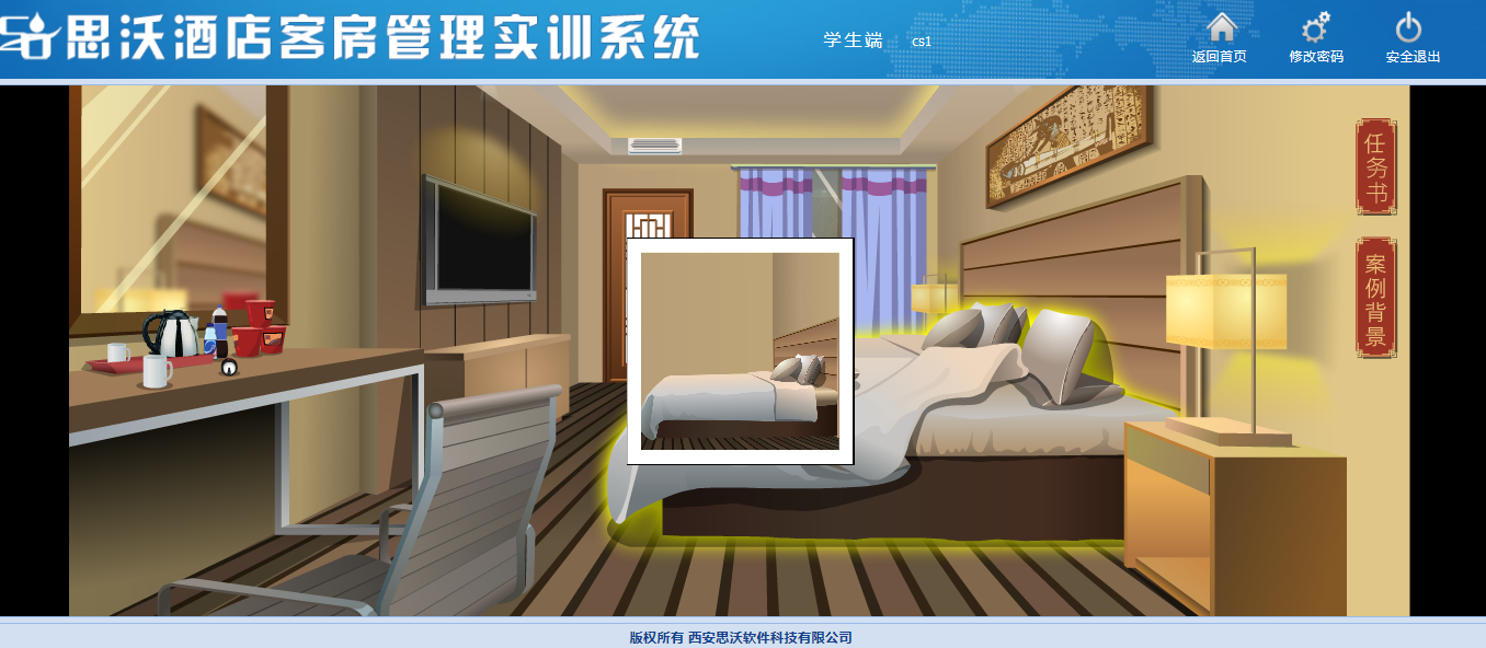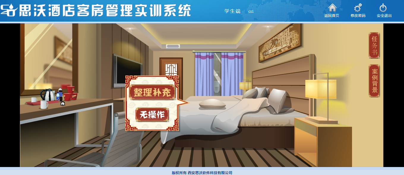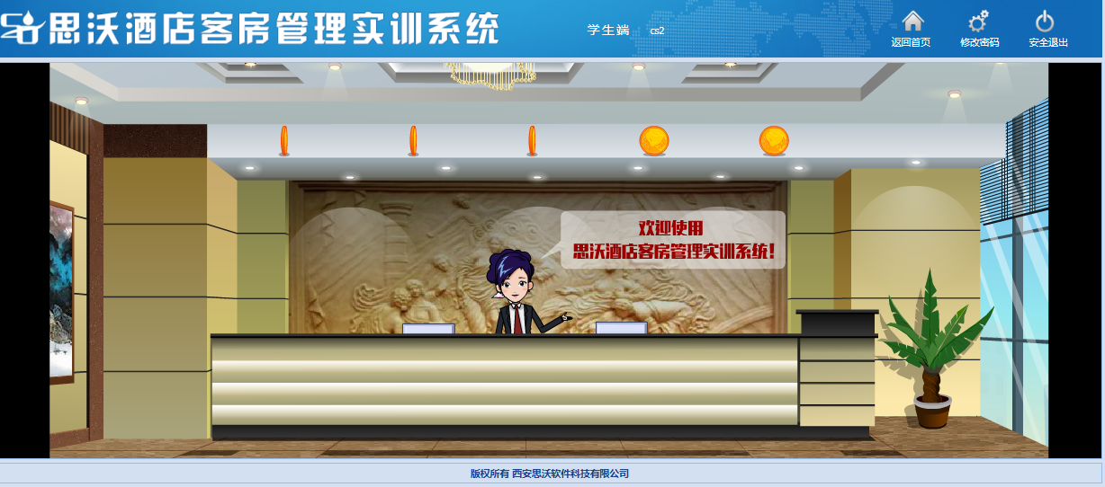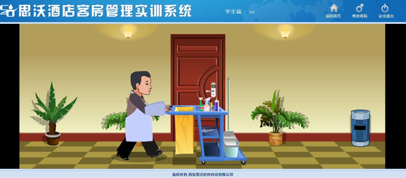 思沃酒店客(ke)(ke)房(fang)管理模擬實訓(xun)系統以flash動畫(hua)模擬酒店情景,學生進(jin)入進(jin)行模擬客(ke)(ke)房(fang)管理日常事務(wu)處理,包括客(ke)(ke)房(fang)設計、引(yin)領入住、客(ke)(ke)房(fang)查房(fang)、客(ke)(ke)房(fang)整理、布草(cao)間(jian)等類型實訓(xun)。