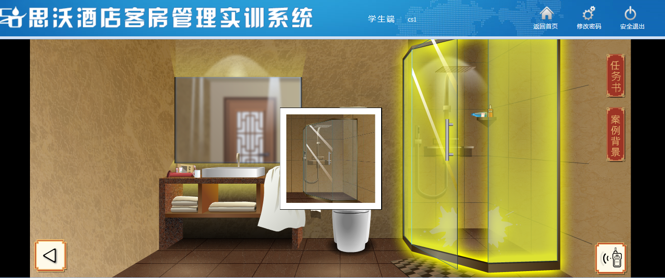 該教學軟(ruan)件平臺(tai)模擬客(ke)房場景(jing),學生通(tong)過場景(jing)互動進(jin)行模擬操作(zuo),包含任務書、案例(li)背景(jing)等,學生在操作(zuo)過程中可隨時查看進(jin)度(du)。學生通(tong)過該教學軟(ruan)件平臺(tai)的(de)虛擬場景(jing)中可對床上用品(pin)、窗簾(lian)、電器、桌(zhuo)椅、茶幾上的(de)消費商(shang)品(pin)、洗漱(shu)臺(tai)、馬桶(tong)、浴(yu)室等進(jin)行整理操作(zuo)。