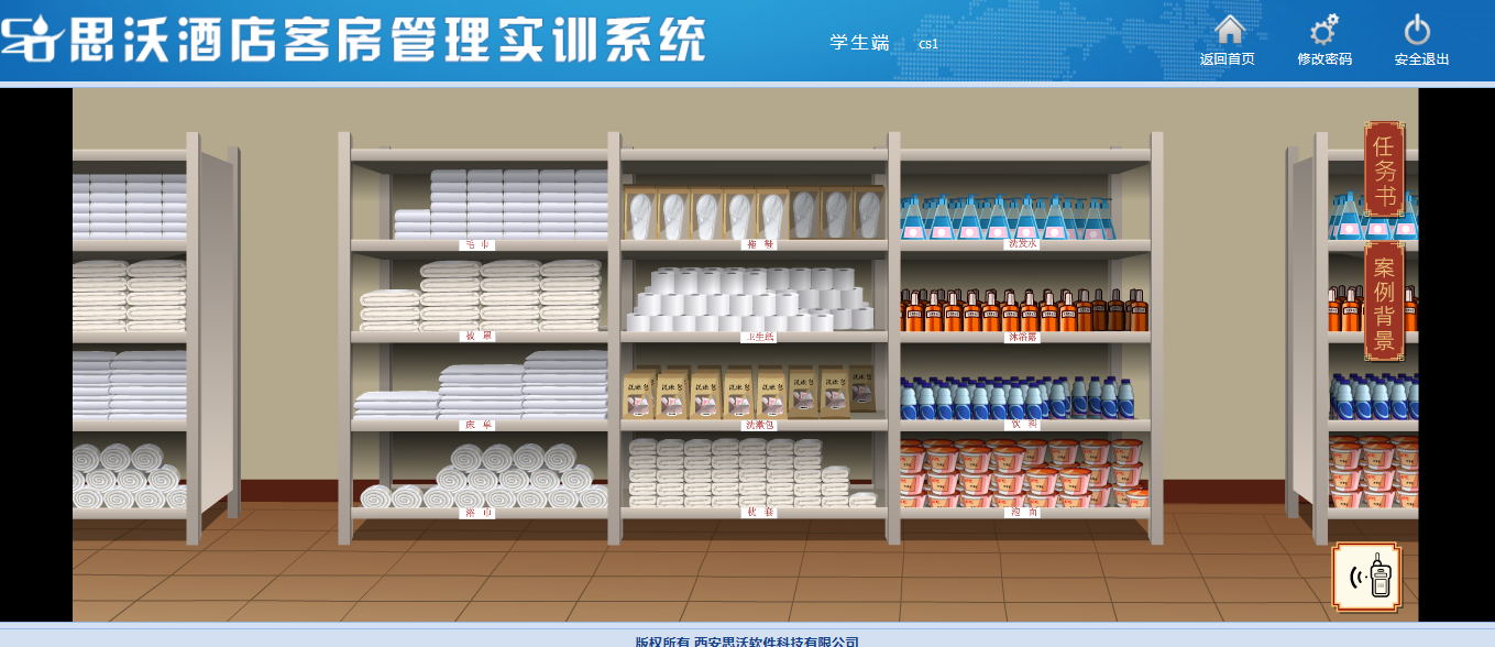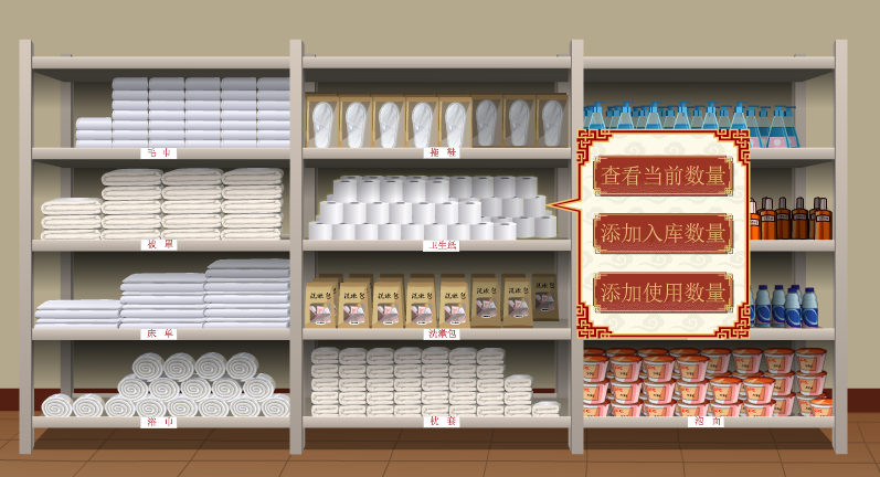 學生模(mo)擬工作(zuo)人(ren)員通過動畫場景互(hu)動對布草(cao)間進行管(guan)理操作(zuo)。并可查看床單、被罩、枕(zhen)套、浴巾、毛巾、洗(xi)漱包(bao)、洗(xi)發水等消耗物(wu)品的庫存(cun)數量,并判斷是否補充。